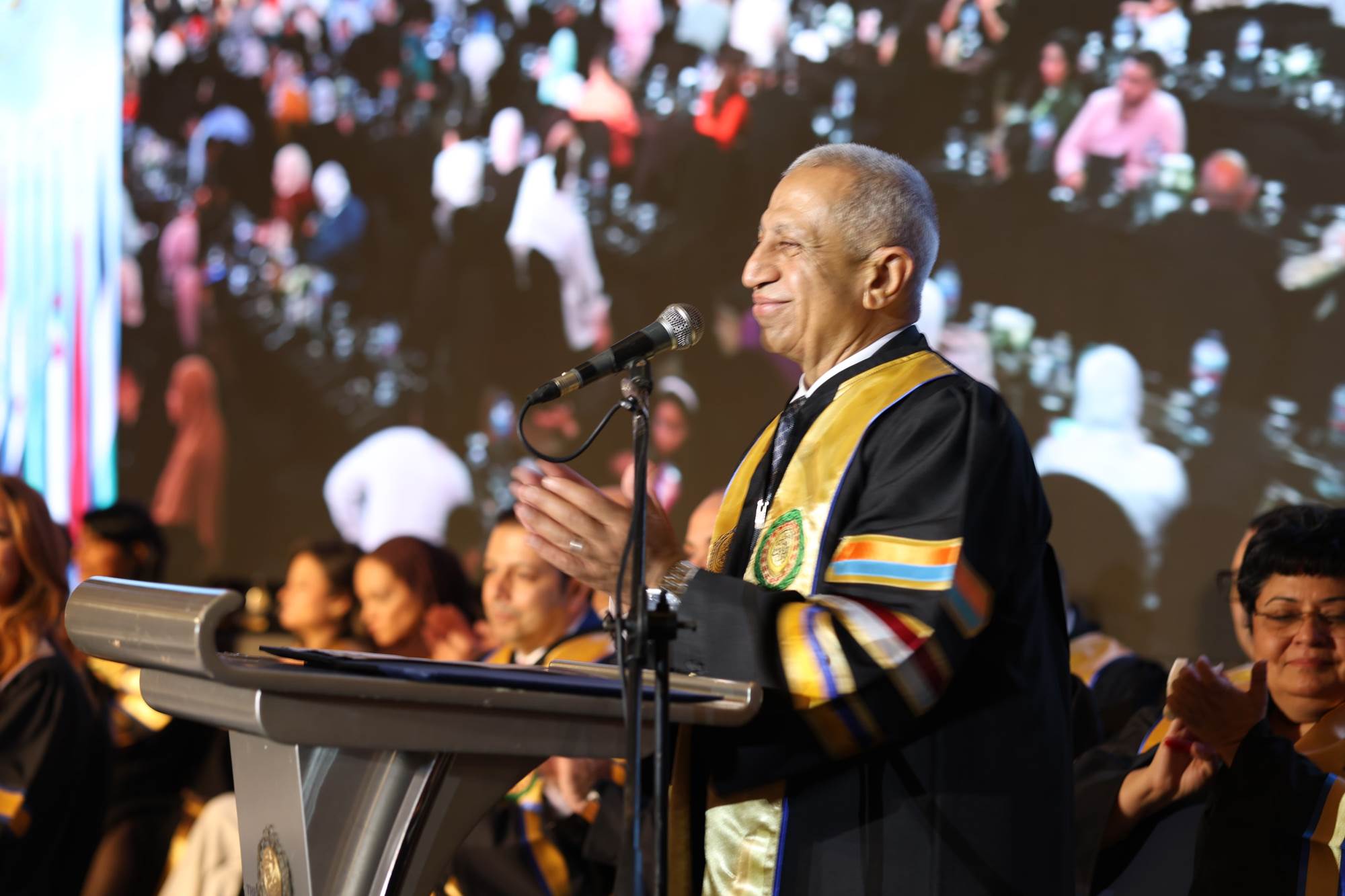كما شهد الحفل حضور سعادة السفير طارق علي الأنصاري، سفير دولة قطر لدى جمهورية مصر العربية ومندوبها الدائم لدى جامعة الدول العربية، الذي ألقى كلمة عبّر فيها عن اعتزازه بالمشاركة في هذا الحدث الأكاديمي المتميز، مشيدًا بالدور الريادي للأكاديمية في إعداد الكفاءات العربية المؤهلة للمستقبل. وأكد سعادته أن التعليم المتطور هو حجر الأساس لبناء مجتمعات قادرة على الابتكار والإسهام في التنمية المستدامة، مشيرًا إلى أن مشاركة خريجين من مختلف الدول العربية في هذا الحفل تجسد روح التعاون والتكامل بين الأشقاء العرب في مجالات العلم والمعرفة.