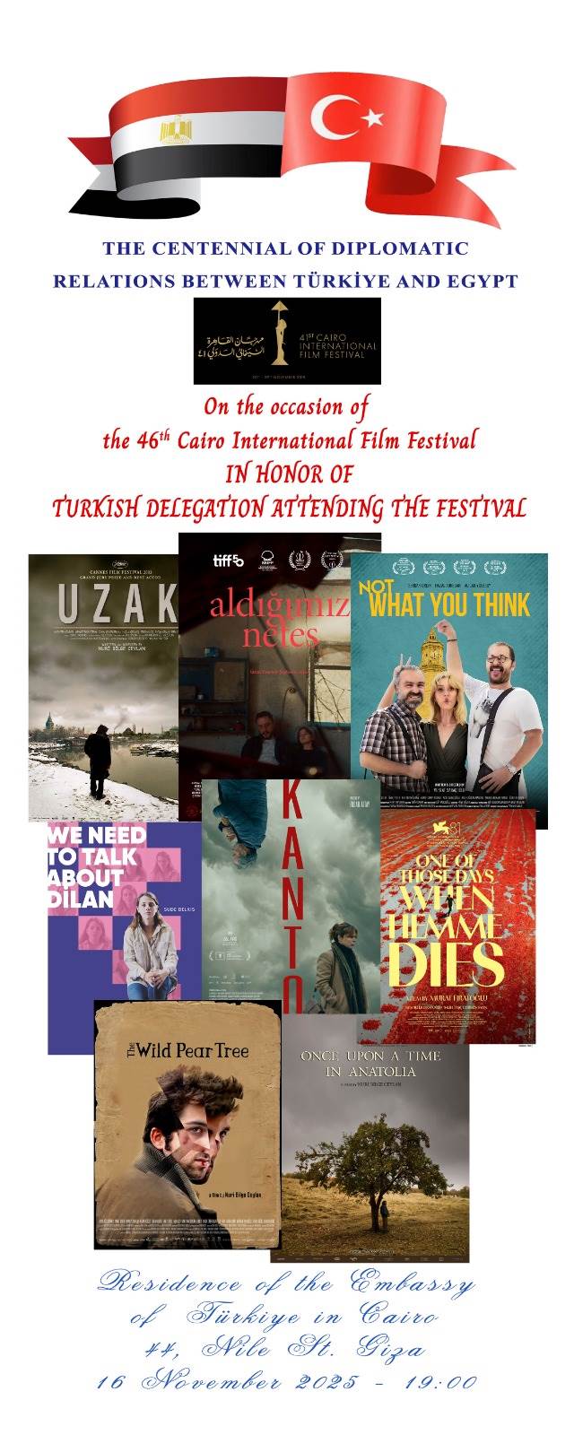 حيث يُقام مهرجان القاهرة السينمائي الدولي السادس والأربعون، في الفترة من 12 إلى 21 نوفمبر 2025، بتنظيم من المديرية العامة للسينما التابعة لوزارة الثقافة والسياحة في جمهورية تركيا وجمعية منتجي التلفزيون والسينما التركية (TESİYAP) ويرأس الوفد التركي بيرول غوفن والمنتج و المدير العام للسينما بوزارة الثقافة والسياحة.