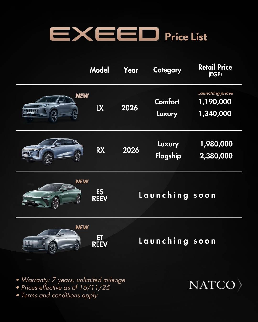 تأتي EXEED LX بفئتين من التجهيز هما Comfort وLuxury، بما يلبي احتياجات العملاء المختلفة ويمنح كل فئة طابعها الخاص من حيث التصميم والمواصفات. وتُطرح السيارة الجديدة بأسعار تنافسية لفترة محدودة بمناسبة الإطلاق، حيث تأتي فئة الـComfort بسعر 1,190,000 جنيه مصري، بينما تتوفر فئة الـLuxury بسعر 1,340,000جنيه مصري، مما يمنح العملاء حرية الاختيار وفق احتياجاتهم وتفضيلاتهم.