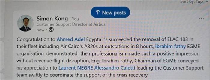 وجّهت شركة أيرباص العالمية الشكر إلى شركة مصر للطيران - الناقل الوطني المصري، و عبرت عن تقديرها الكبير لمستوى التنسيق الفعال والاستجابة السريعة التي قدمها فريق عمل مصر للطيران خلال تنفيذ التحديثات البرمجية اللازمة التى أصدرتها شركة أيرباص مؤخرًا على طرازات A320 وذلك خلال وقت قياسي.