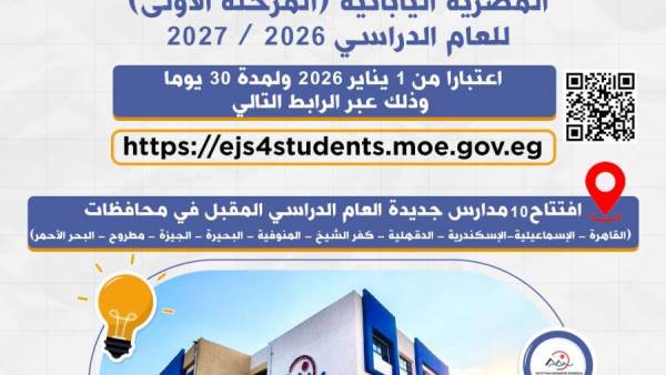 كما تعلن وزارة التربية التعليم فتح باب التقديم للطلاب في جميع المدارس المصرية اليابانية بمختلف محافظات الجمهورية، للعام الدراسي 2026 / 2027، وذلك بداية من غد الخميس الموافق 1 يناير 2026 ولمدة شهر، وذلك من خلال الرابط التالي: https://ejs4students.moe.gov.eg/