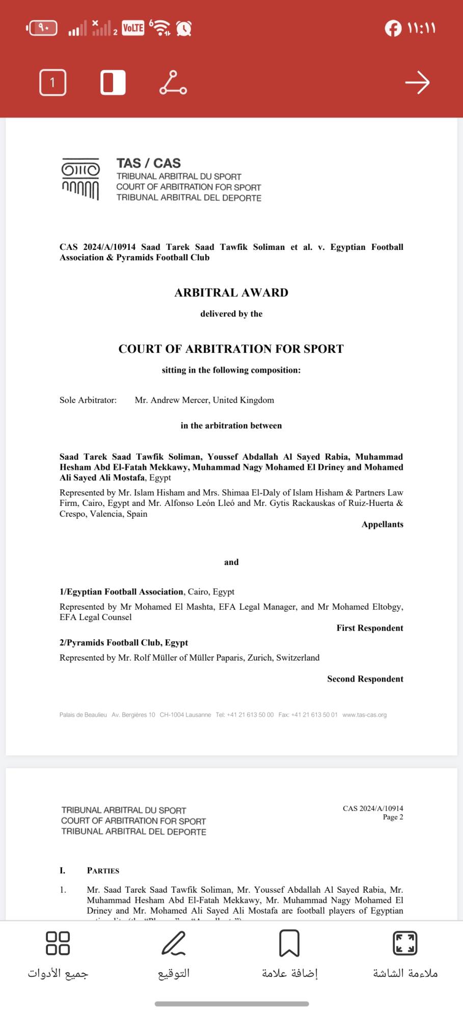 "كاس” ترفض استئناف لاعبي 2009 وتؤكد صحة موقف نادي بيراميدز القانوني