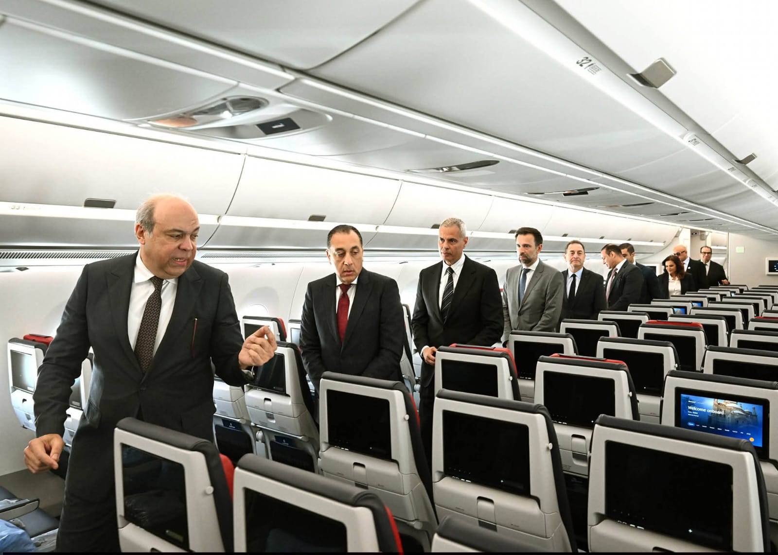 خلال فعاليات الاحتفال بانضمام أول طائرة من طراز Airbus A350-900 إلى أسطول الناقل الوطني، تفقد الدكتور مصطفى مدبولي، رئيس مجلس الوزراء، ومرافقوه، الطائرة الجديدة منAirbus ، التى تأتي ضمن صفقة أبرمتها شركة "مصر للطيران" مع شركة "Airbus" لضم 16 طائرة من طراز A350-900 للأسطول الوطني.