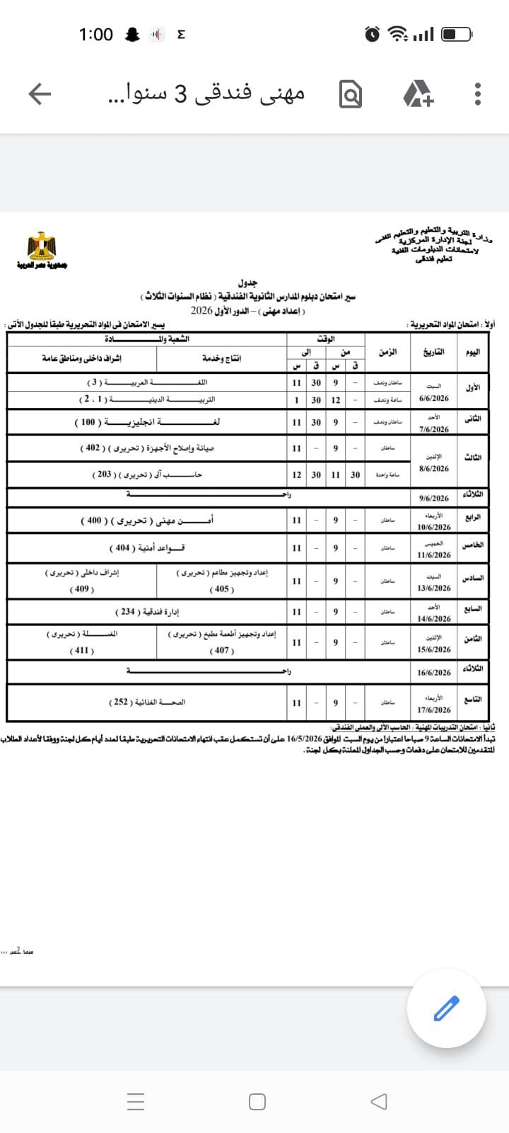 ومن المقرَّر أن تبدأ امتحاناتُ الدبلومات الفنية يوم السبت الموافق 6 يونيو 2026، وذلك وفقًا للجداول المُعلنة.