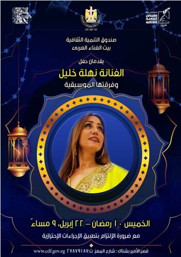 وفى بيت الغناء العربى–قصر الأمير بشتاك(بشارع المعز)، تقدم الفنانة نهلة خليل أمسية طربية تضم مجموعة من أشهر الأغانى المصرية .