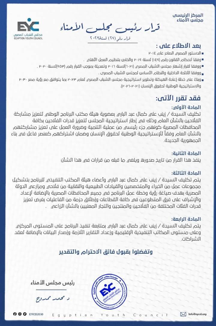 تكليف زينب عبد الباري بعضوية المجلس المركزي لمجلس الشباب المصري
