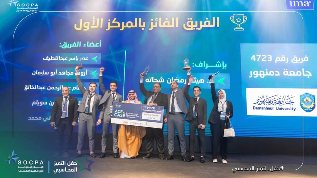 قدم الدكتور إلهامي ترابيس رئيس جامعة دمنهور التهنئة لطلاب كلية التجارة والفريق المشارك في مسابقة معهد المحاسبين الإداريين للطلاب 2024 . "IMA middle east student case competition 2024" لفوزهم بالمركزين الأول والثاني بالمرحلة النهائية التي أقيمت لتحديد المراكز الثلاثة الأولى في العاصمة السعودية الرياض برعاية معهد المحاسبين الاداريين الأمريكي IMA و الجمعية السعودية للمحاسبين القانونيين SOCPA. فاز الفريق بالمركز الأول بقيمة مالية قدرها ٥٠٠٠ دولار، والمكون من الطلاب: عمر ياسر محمد عبداللطيف، أروى مجاهد محمد أبو سليمان، حسام عبدالرحمن أحمد ٠عبدالخالق، علاء عماد الدين سويلم، مهند عبدالعاطي محمد أبو السعود، تحت إشراف الدكتور هيثم رمضان المدرس بقسم المحاسبة. وفاز الفريق بالمركز الثاني بقيمة مالية قدرها ٢٥٠٠ دولار . والمكون من الطلاب:شريف عاطف محمد عبدالكريم، ندى خالد فتحي محمود، نهال عبدالعزيز حميدة مبروك، دسوقي علي دسوقي عبدالله، إبراهيم محسن عبدالحميد عوض، تحت إشراف الدكتور إيهاب عبدالسميع المدرس بقسم المحاسبة. وأعرب الدكتور إلهامي رئيس الجامعة عن بالغ سعادته بأبنائه الطلاب مشيداً بالانجاز المتميز ومشاركتهم المشرفة حيث يعد فوز الفريقين بالمركزين الأول والثاني سابقة في تاريخ مشاركات الجامعات المصرية، موضحاً دور الجامعة في دعم إبداعات شبابها من الطلاب وتقديم كافل سبل الدعم لهم ، مؤكداً على قدرة طلاب الجامعة على المشاركة في المسابقات والمحافل الدولية المختلفة وتميزهم وفوزهم بمراكز متقدمة ، متمنياً لهم مزيداً من التفوق والنجاح الدائم.
