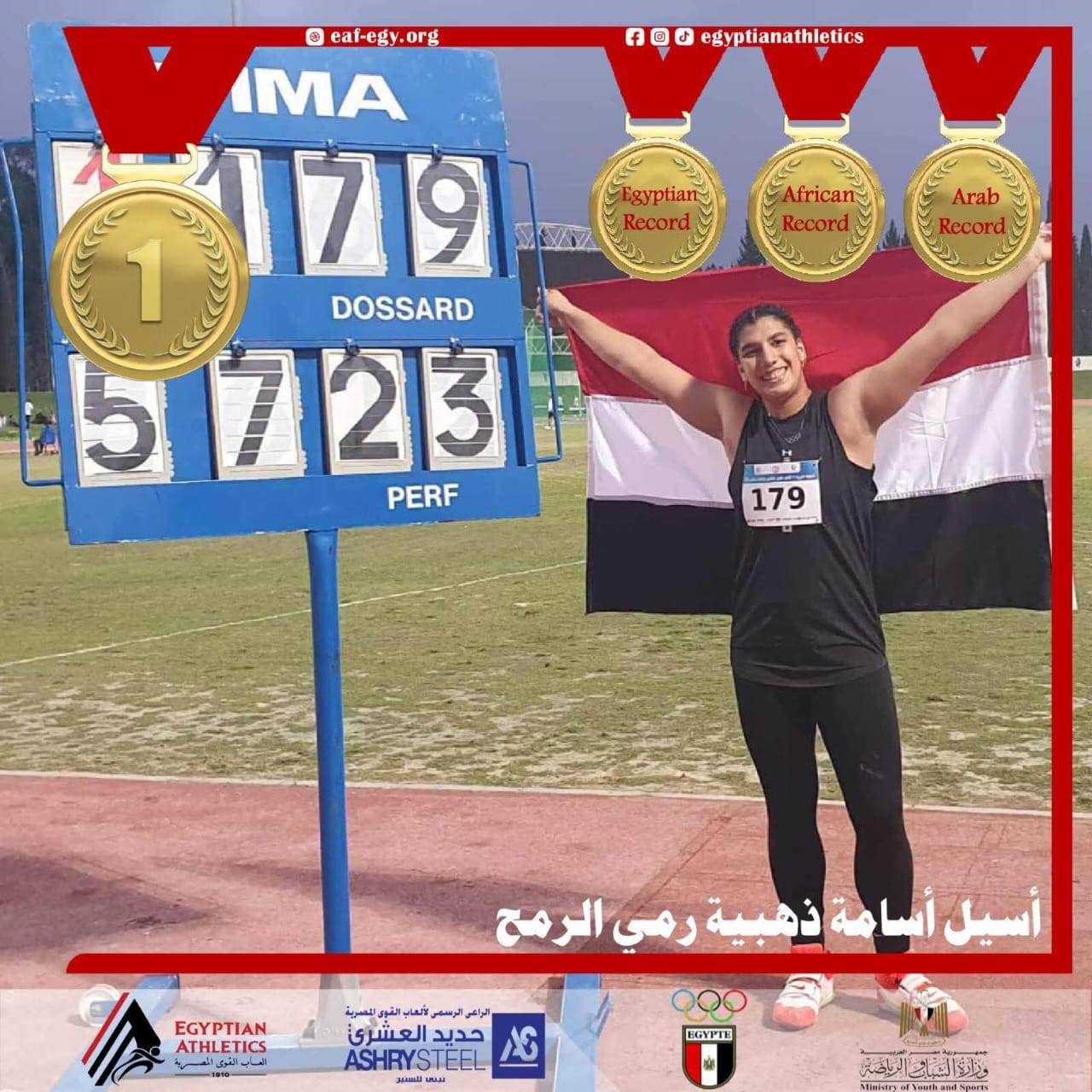 فجرت اللاعبة الصاعدة في ألعاب القوى أسيل أسامة مفاجأة كبيرة برمية تاريخية بلغت ٥٧.٢٣ متر، لتسجل رقم مصري وعربي وأفريقي جديد معتمد باسمها ويضعها على عرش اللعبة بلا منازع وذلك ضمن فعاليات البطولة العربية بتونس.
