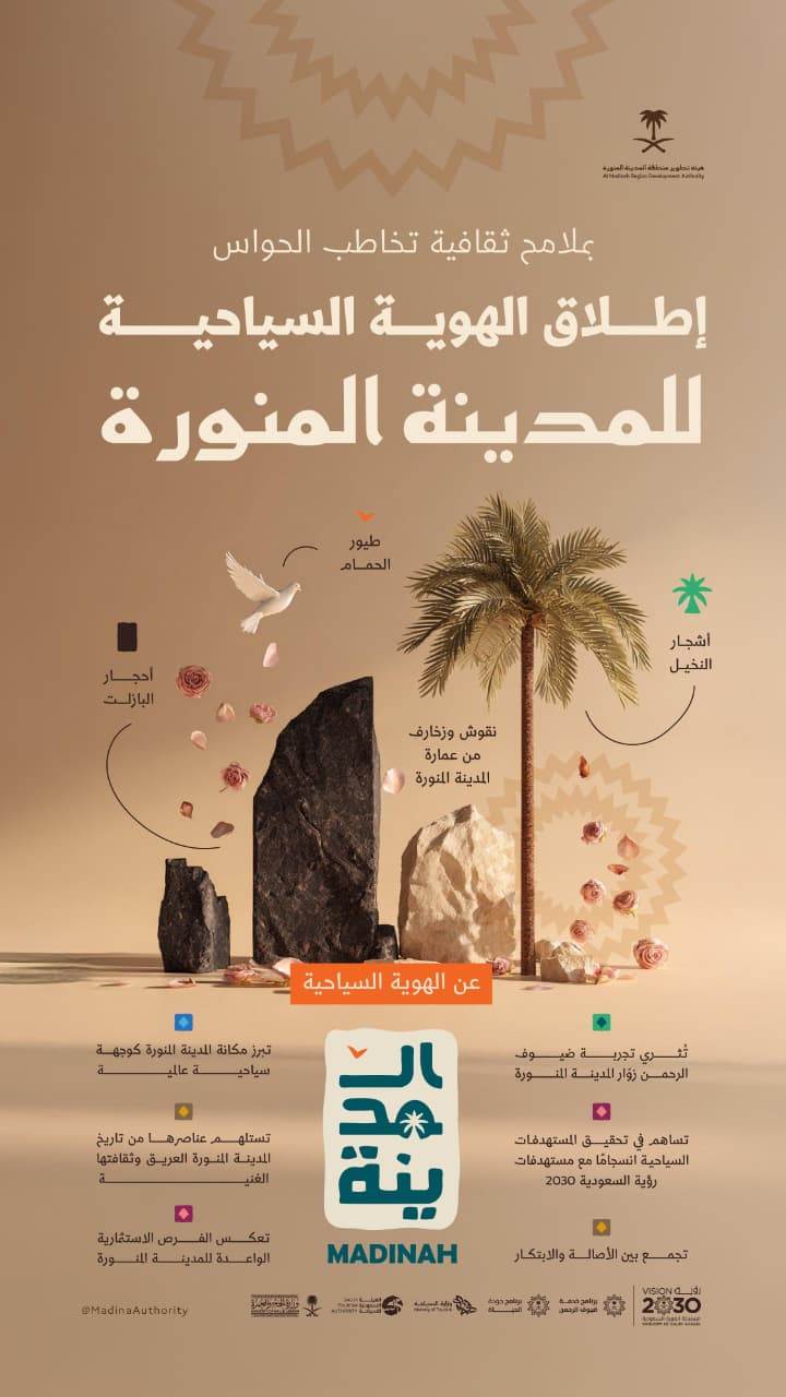 تمثّل "الهوية السياحية للمدينة المنورة" التي أطلقها صاحب السمو الملكي الأمير سلمان بن سلطان بن عبدالعزيز أمير منطقة المدينة المنورة رئيس مجلس هيئة تطوير المنطقة، خطوةً إستراتيجيةً رائدة، تُجسّد عناية القيادة السعودية بهذه المدينة المباركة، وتواكب ما تشهده من مشاريعٍ ومبادراتٍ نوعية، تُسهم في تحقيق مستهدفات رؤية المملكة 2030. وتهدف الهوية السياحية إلى دعم توجهات المنطقة لإثراء تجربة الزوار وضيوف الرحمن، وتعزيز جودة حياة السكان، والعمل على تعزيز مكانة المدينة المنورة وجهة عالمية رائدة. وتستمدُّ الهوية السياحية عناصرها من عُمق المدينة التاريخي والثقافي، ومن رموزها الأصيلة المُستلهمة من تراثها، مثل خطّ المدينة الطِّباعي، والحرّات، وأحجار البازلت، وأشجار النخيل، والعِمارة التقليدية، لتُشكّل علامةً بصريةً مُميزة، تجمع بين الأصالة والحداثة، وتُرسّخ صورة المدينة وجهةً تعتزّ بالماضي، وتفتحُ آفاقًا للمستقبل. وتسعى الهوية السياحية إلى ترسيخ صورة ذهنية مُتجددة للمدينة المنورة وجهةً عالميةً متميزة، وتعزز ارتباطها العاطفي بالسكان والزوار، بوصفها أيقونة تاريخية ثقافية، تربط بين الماضي والمستقبل. وأوضح أمين منطقة المدينة المنورة الرئيس التنفيذي لهيئة تطوير المنطقة المهندس فهد بن محمد البليهشي أن إطلاق الهوية السياحية يأتي إنفاذًا لتوجيهات سمو أمير المنطقة الرامية إلى تنمية القطاع السياحي، وتعزيز مكانة المدينة المنورة وجهةً عالمية، وانسجامًا مع مستهدفات رؤية المملكة 2030، مشيرًا إلى أن توقيت إطلاق الهوية السياحية بالتزامن مع احتفالات اليوم الوطني الـ95، شكّل حدثًا فارقًا في ذاكرة السكان والزوار، ترجم حرص سمو أمير المنطقة على أن يكون الإطلاق بحضور الأهالي تقديرًا لهم. وأكد أن الهوية السياحية تبرز التنوع الثقافي والمعماري للمدينة المنورة، لتجسّد تميز مكانتها السياحية، وتحافظ على هويتها التاريخية والثقافية ومسيرتها نحو المستقبل، لتقديم تجربة متجددة تعكس الأصالة وتواكب التطور. وبين أن "الهوية السياحية" للمدينة المنورة تعكس الفُرص الواعدة أمام المستثمرين والعاملين في القطاع السياحي, الذي يُعدُّ رافدًا حيويًا للتنمية الاقتصادية، والاجتماعية، مفيدًا أن العمل التكاملي مع مختلف الشركاء في القطاعين الحكومي والخاص، يفتحُ المجال لصناعة وجهات سياحية متنوعة، تُسهم في تحسين جودة الحياة، وإثراء تجربة الزوار، عبر استثمار مقومات المدينة الطبيعية والجغرافية، وتحويلها إلى محركٍ رئيسي لصناعة السياحة. يُذكر أن إطلاق الهوية السياحية للمدينة المنورة يتكامل مع ما حققته من ريادة عالمية في القطاع السياحي، إذ أُدرجت ضمن قائمة أفضل (100) وجهة سياحية عالميًّا لعام 2024م، وفقًا لتقرير يورومونيتور إنترناشيونال، وحققت المدينة تقدمًا عالميًا في مؤشر IMD للمُدُن الذكية لعام 2025م، متقدمة (7) مراتب، لتُصبح في المرتبة (67) عالميًا، في خطوة تعكس تقدمها في تبني الحلول الذكية، وتطوير بيئة حضرية مُستدامة، وبرزت تجربة المدينة المنورة الريادية في توطين أهداف التنمية المستدامة خلال أعمال المنتدى السياسي رفيع المستوى بالأمم المتحدة للعام 2025.