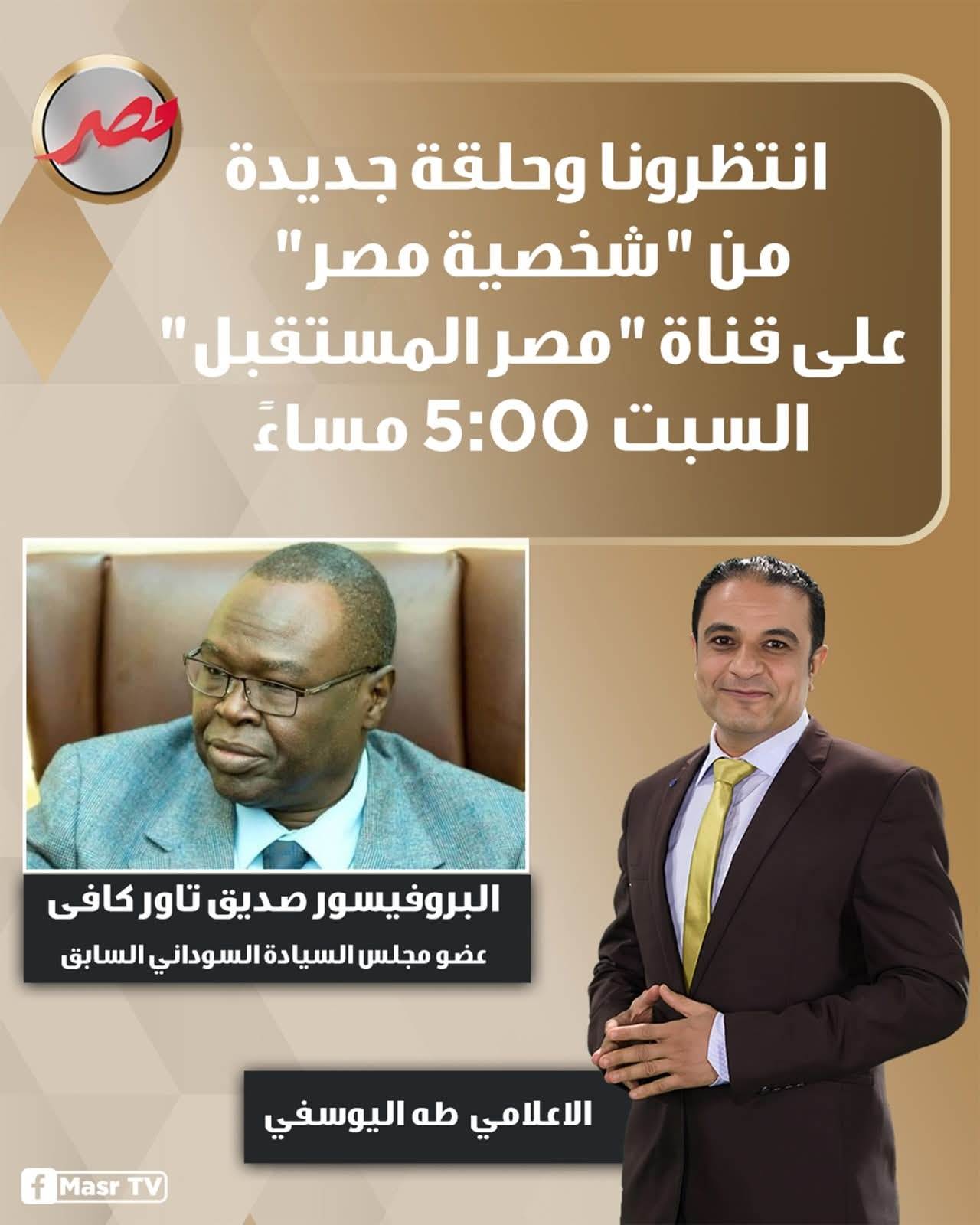 يستضيف برنامج شخصية مصر السبت المقبل على الهواء مباشرة في تمام الساعه 5:00 مساء البروفسير دكتور صديق تاور كافي عضو مجلس السيادة السوداني السابق ورئيس مجلس امناء المجموعه السودانيه لمناصرة اللاجئين. في لقاء نطرح فيه ما لا يقال سابقا عن الاحداث في السودان بدءا من الانفصال وصولا الى الان وتاثيرها على الاقليم السودان الى اين ؟