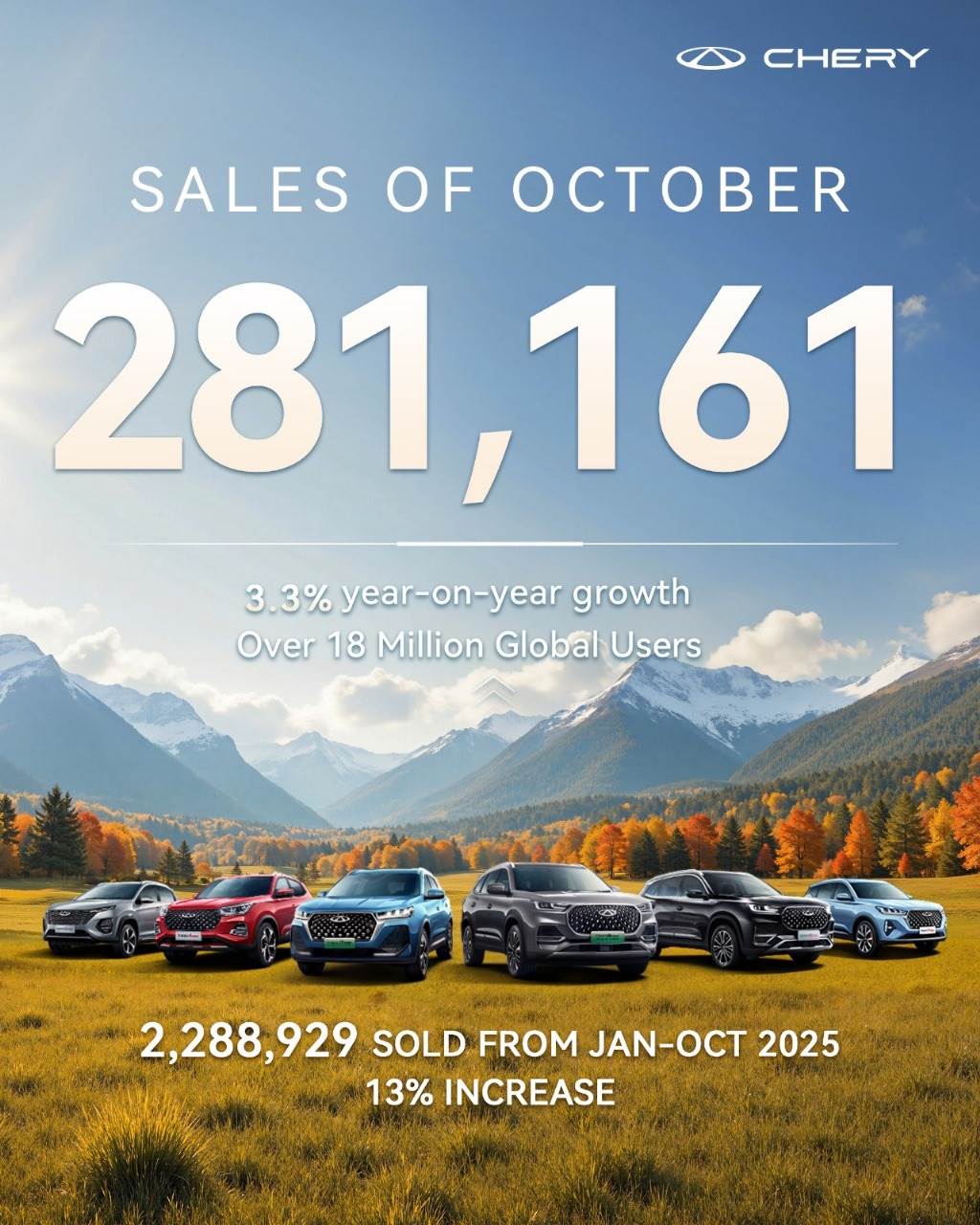 وخلال الفترة من يناير إلى أكتوبر، حققت مجموعة شيري مبيعات تراكمية بلغت 2,288,929 سيارة، بزيادة سنوية قدرها 13% محققة رقماً قياسياً جديداً للفترة. ومع تجاوز قاعدة مستخدميها العالميين 18 مليون مستخدم، منهم أكثر من 5.56 مليون خارج الصين، تدخل الشركة مرحلة جديدة من التوسع الدولي عالي الجودة.