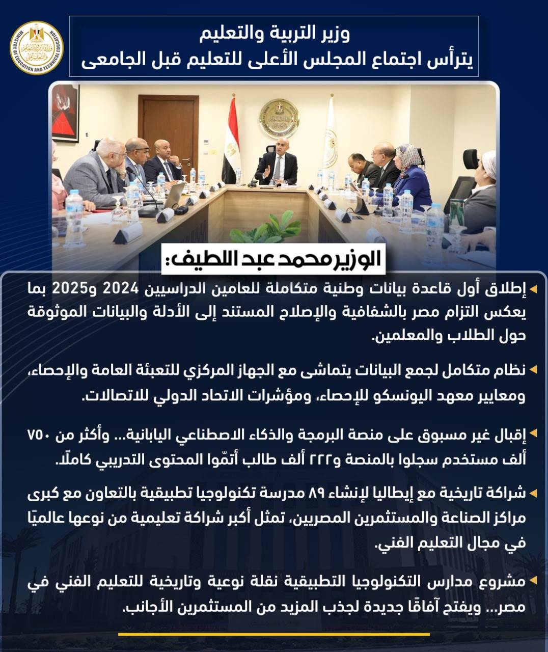 وتطرق الاجتماع إلى استعراض مؤشرات التعليم قبل الجامعى، حيث أعلن الوزير محمد عبد اللطيف إطلاق أول قاعدة بيانات وطنية متكاملة للعامين الدراسيين 2024 و2025، بما يعزز الشفافية والإصلاح المستند إلى الأدلة، والمواءمة الكاملة مع المنهجيات الإحصائية الدولية والبيانات الموثوقة حول الطلاب والمعلمين، وعبر نظام متكامل لجمع البيانات يتماشى مع الجهاز المركزي للتعبئة العامة والإحصاء ومعايير معهد اليونسكو للإحصاء ومؤشرات الاتحاد الدولي للاتصالات، لتضع مصر نفسها ضمن الحركة العالمية لتعزيز المساءلة التعليمية وتحقيق أهداف التنمية المستدامة (الهدف الرابع).