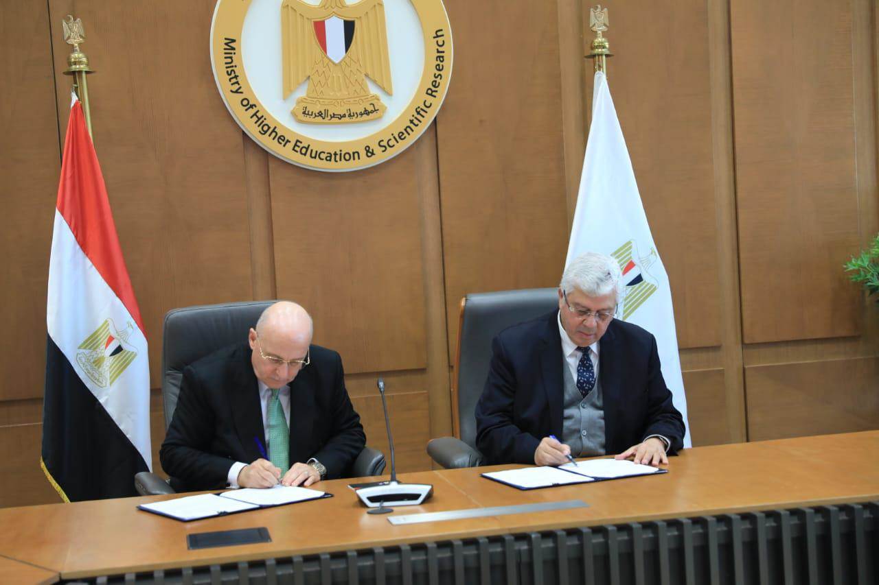 وقع الاتفاقية الدكتور أيمن عاشور وزير التعليم العالى والبحث العلمي بصفته رئيس مجلس إدارة بنك المعرفة المصرى، الدكتور عادل عدوى، رئيس المكتب التنفيذي للمجلس العربى للاختصاصات الصحية.