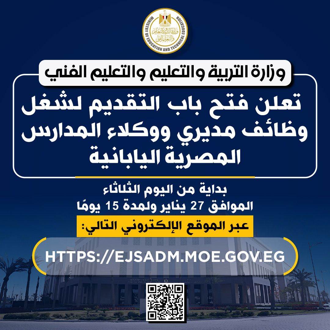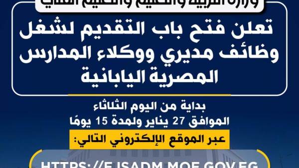أعلنت وزارة التربية والتعليم والتعليم الفني فتح باب التقديم لشغل وظائف مديرين ووكلاء بالمدارس المصرية اليابان