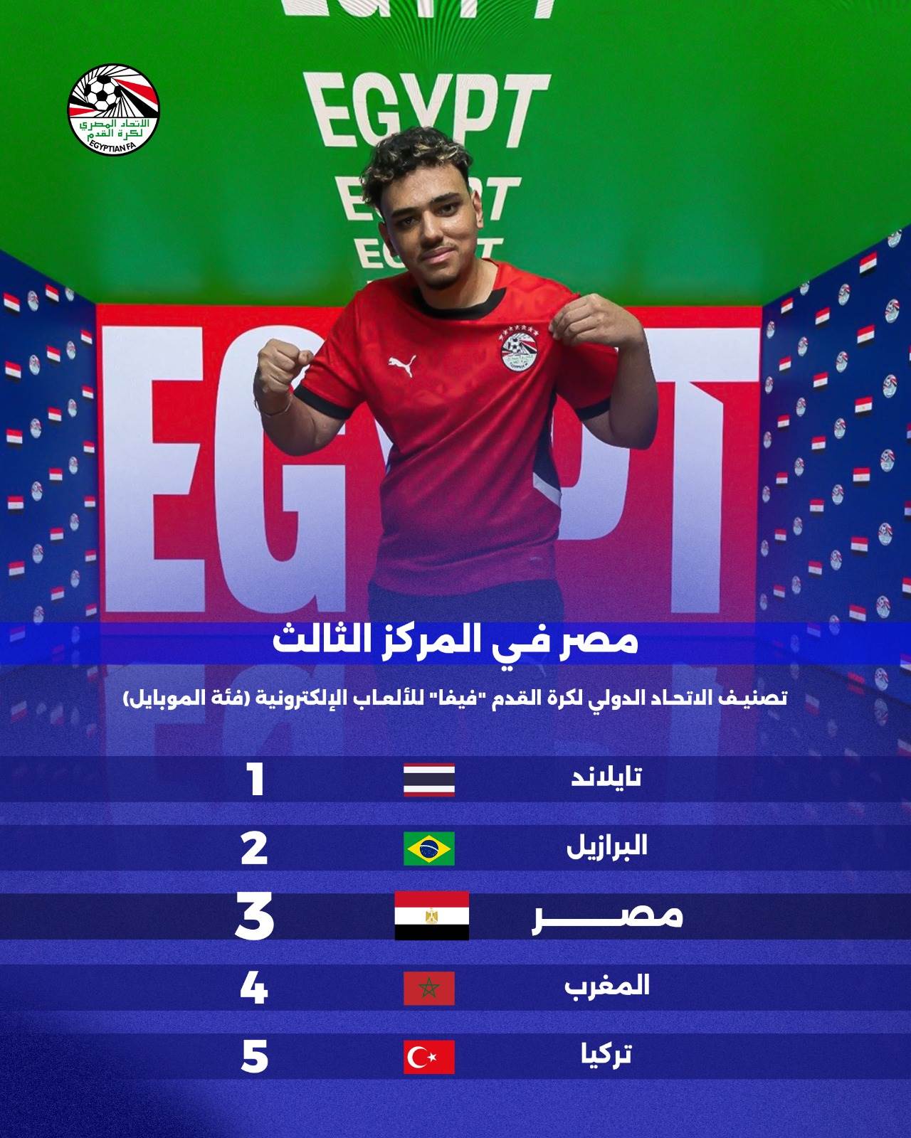 أعلن الاتحاد الدولي لكرة القدم "فيفا" التصنيف العالمي للرياضات الإلكترونية، والذي شهد ظهورًا تاريخيًا لمصر، باحتلال المركز الثالث عالميًا في فئة "الموبايل"، والأول عربيًا وأفريقيًا، بعد أول مشاركة في كأس العالم لكرة القدم الإلكترونية.