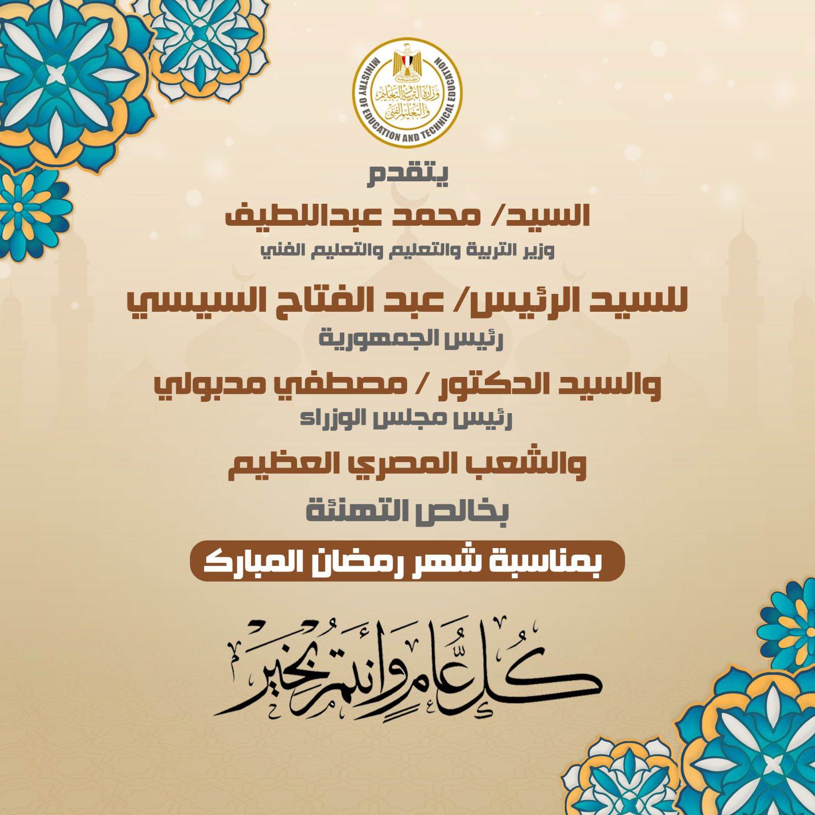 تقدّم السيد محمد عبد اللطيف وزير التربية والتعليم والتعليم الفني بخالص التهنئة إلى فخامة السيد الرئيس عبد الفتاح السيسي وإلى السيد الدكتور مصطفى مدبولي رئيس مجلس الوزراء وإلى الشعب المصري العظيم، بمناسبة حلول شهر رمضان المعظم.