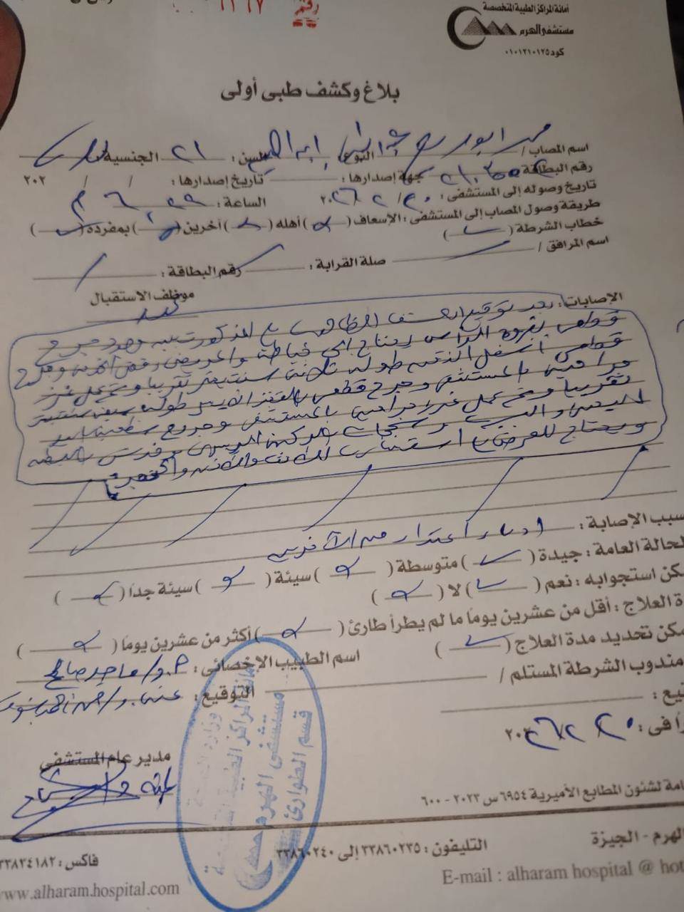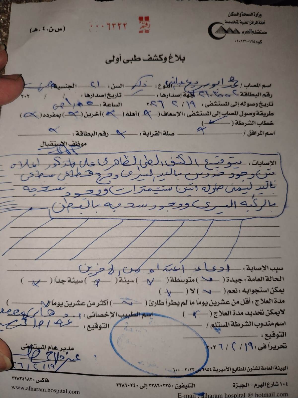 وأضافت أنها سارعت بتحرير محضر جديد حمل رقم 1868 لسنة 2026 بقسم شرطة الطالبية، وأرفقت به التقارير الطبية الدالة على الإصابات، مطالبة بسرعة التحرك لوقف ما وصفته بسلسلة الاعتداءات المتكررة، التي تسببت – على حد قولها – في حالة رعب دائم لها ولنجلها، وجعلت حياتهما مهددة في أي لحظة.