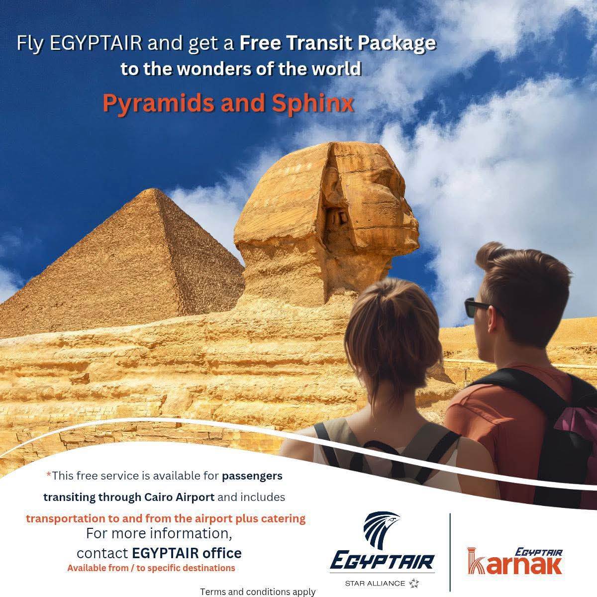 في خطوة جديدة تعكس توجه الدولة المصرية نحو تنشيط حركة السياحة الوافدة إلي مصر وكذلك سياحة الترانزيت، وتأكيدًا علي الدور المحوري الذي يقوم به الناقل الوطني مصر للطيران في نقل ملايين المسافرين سنويًا عبر مطار القاهرة الدولي إلي العديد من الوجهات الخارجية، أعلنت مصر للطيران وذراعها السياحي – قطاع السياحة (الكرنك) عن إطلاق باقات سياحية مجانية لعملاء الشركة الوطنية المسافرين عبر مطار القاهرة الدولي من عدد من نقاط شبكة مصر للطيران الدولية، وذلك حرصًا منها علي تعزيز حركة سياحة الترانزيت العابرة وفقًا لضوابط تأشيرة الترانزيت المجانية التي تتيح الإقامة في مصر لمدة تصل إلى 96 ساعة.