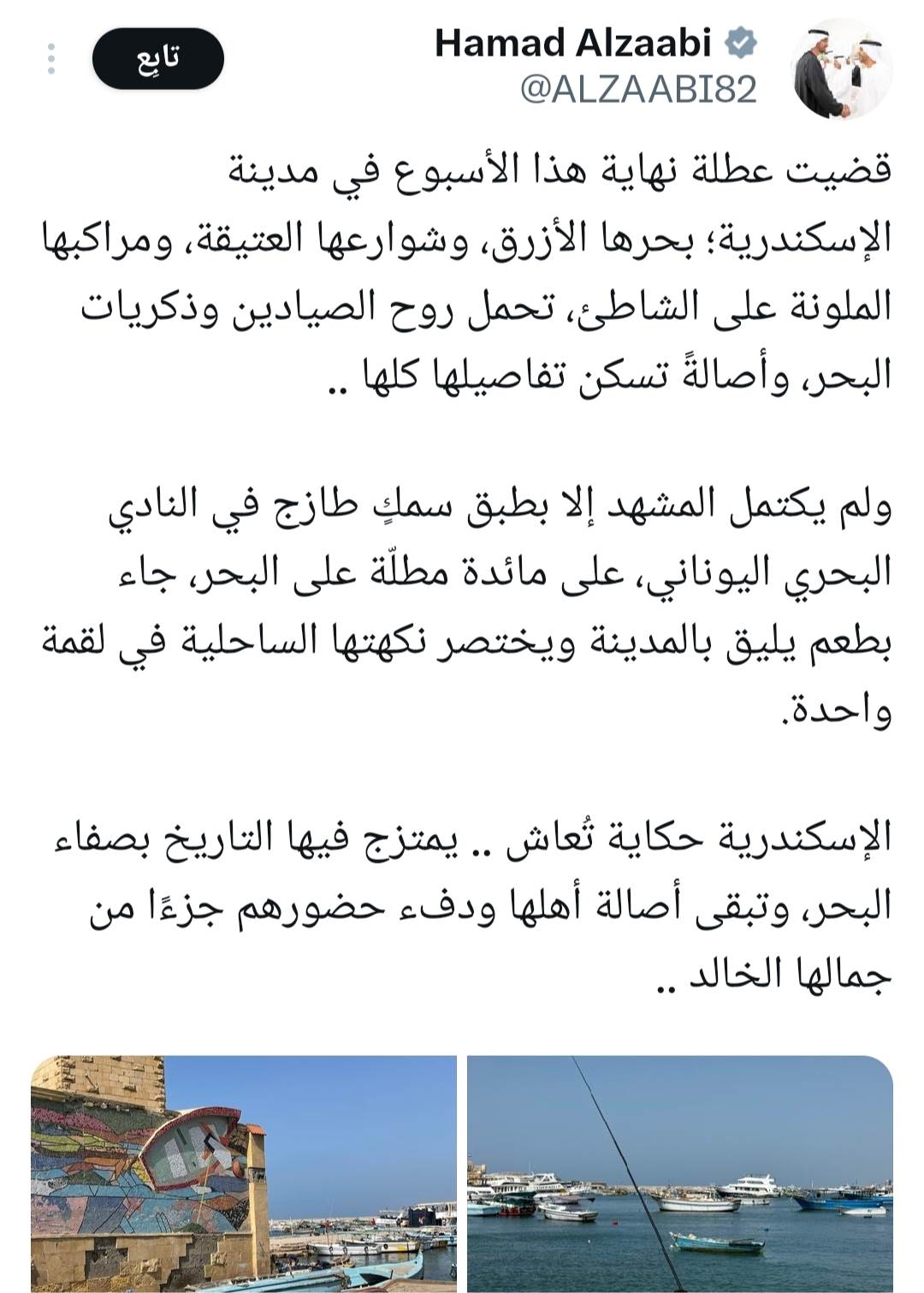 واختتم السفير الإماراتي حديثه مؤكدًا أن الإسكندرية ستبقى مدينة خالدة في الوجدان، يمتزج فيها التاريخ بصفاء البحر، ويظل جمالها حاضرًا في الذاكرة مهما ابتعدت المسافات.