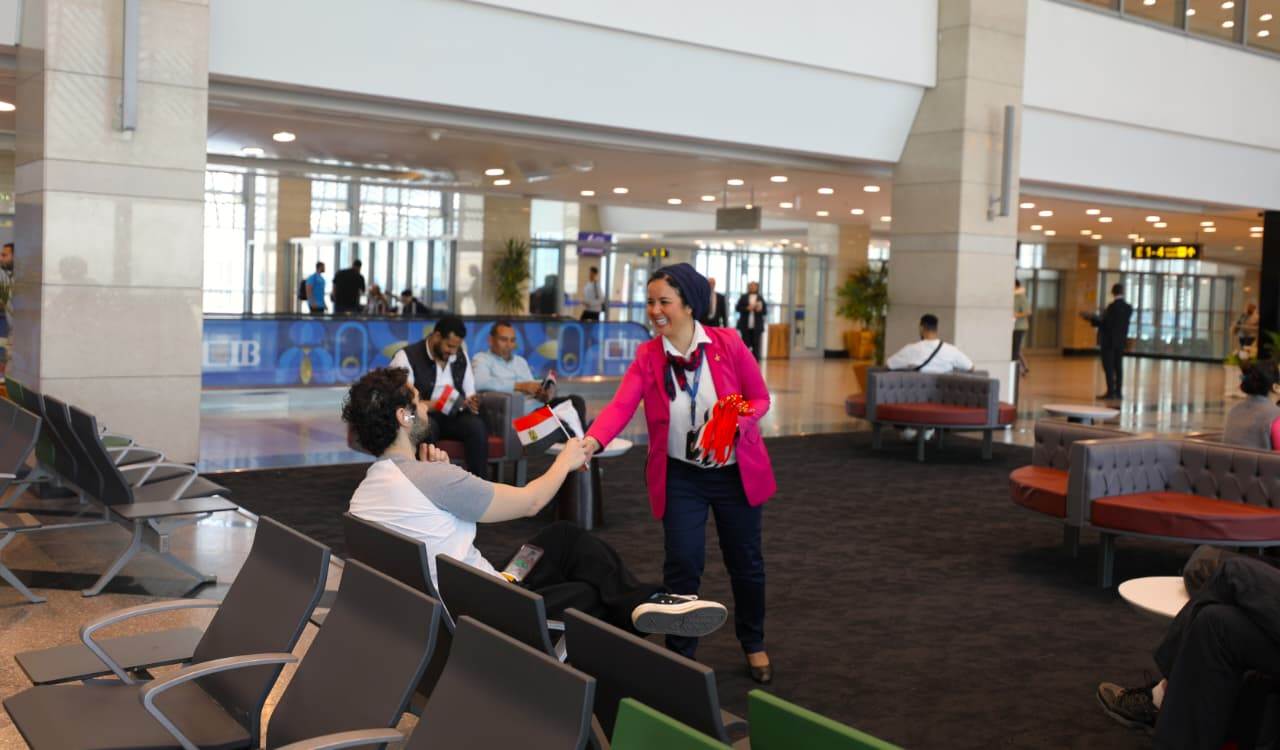 وقام فريق العلاقات العامة والإعلام بشركة ميناء القاهرة الجوي باستقبال المسافرين بالورود وتوزيع الشيكولاتة وأعلام مصر في لفتة تعكس روح الانتماء والاعتزاز بالوطن.